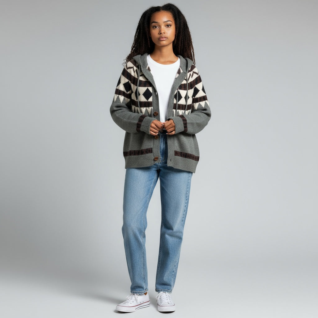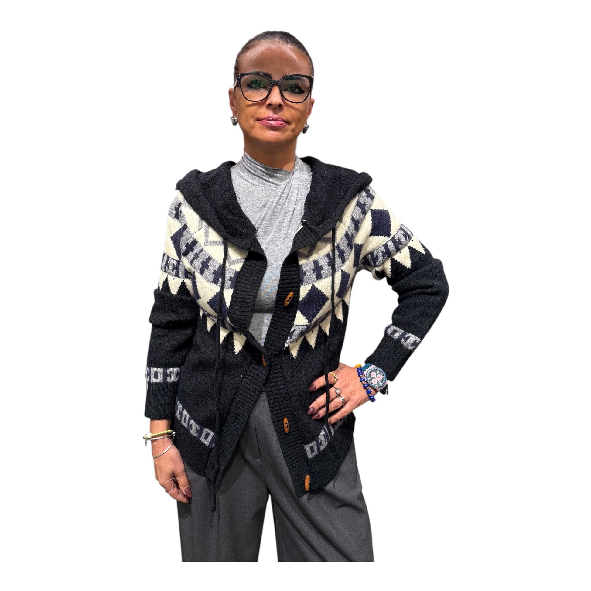 - cardigan morbido in lana con cappuccio e bottoni in legno