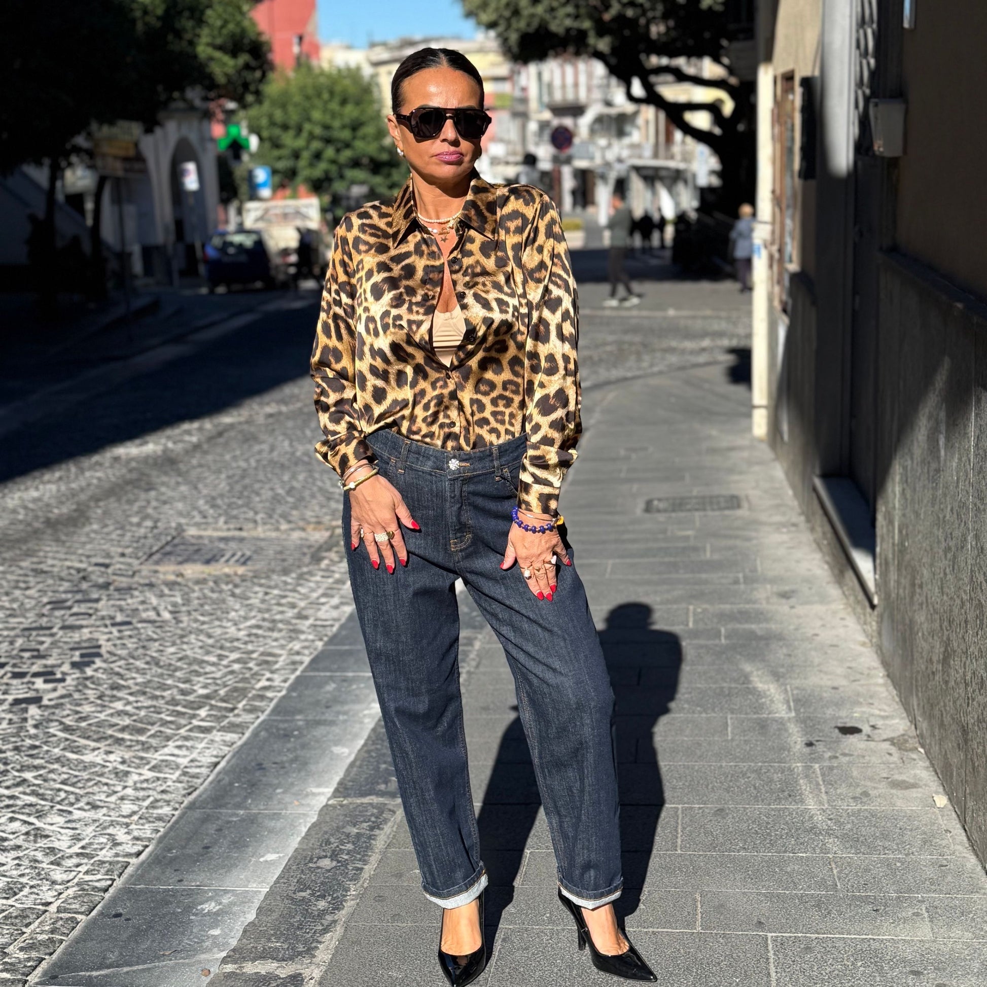 - modello slim con bottone gioiello e fondo stretto alla caviglia